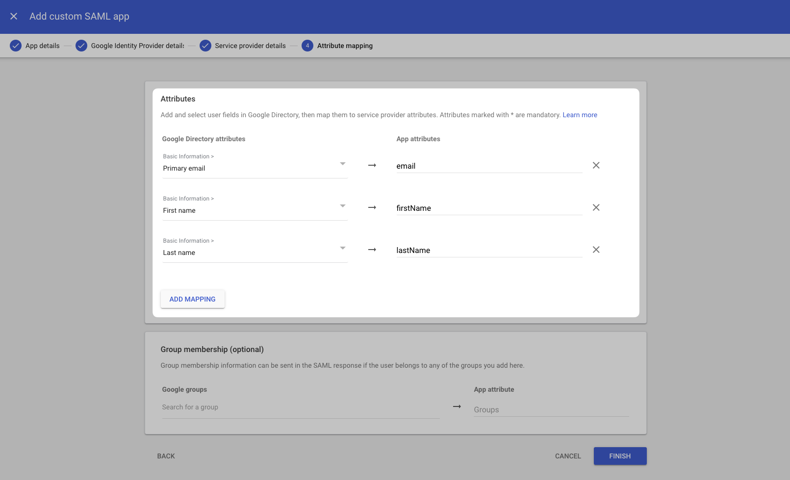 On the next screen, under the Attributes section, click Add Mapping and add the following attribute mappings: