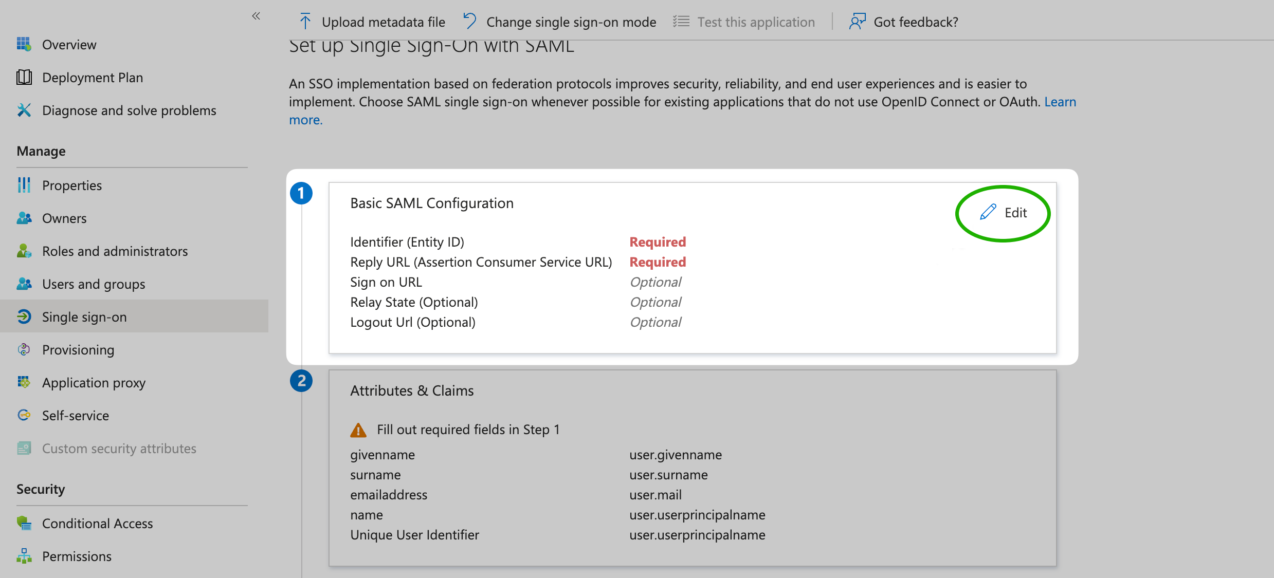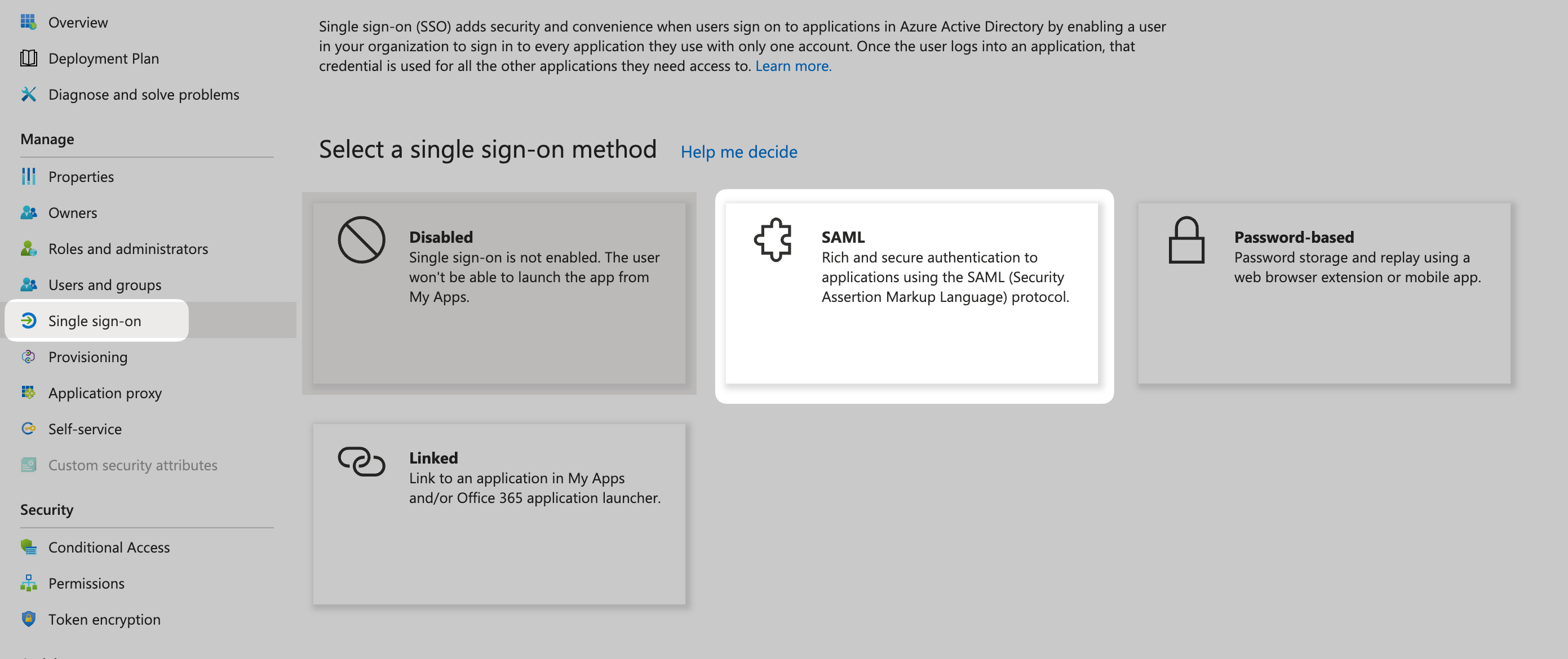 Under the Manage section in the left sidebar, select Single sign-on. Then, click on SAML.