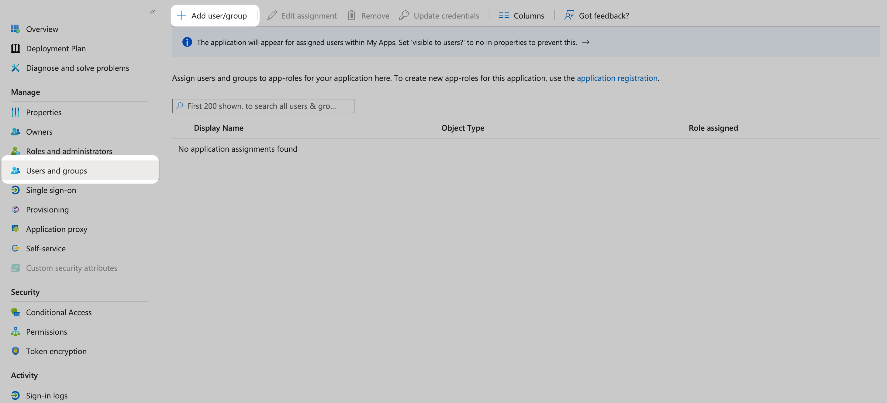 From your application, click the Users and groups from the left navigation menu and click Add user/group.